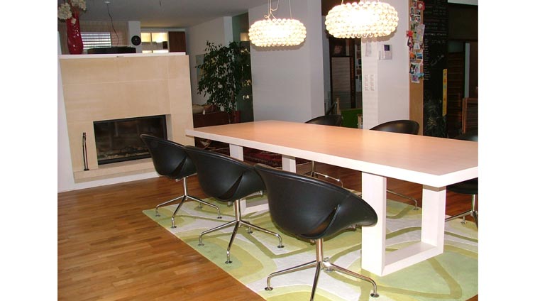 Küche in Markassa mit Schleiflackfronten, Geräte Imperial mit grüner Glasfront, Arbeitsplatte Stein Eucalyptus.