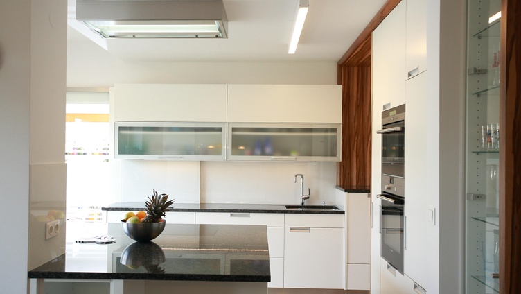 Küche mit Essecke in Schleiflack weiß, Steinplatte, Satinnuss