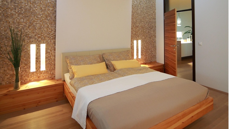 Schlafzimmer in Zirbe geölt, Steinzeugfliese, Leder.....