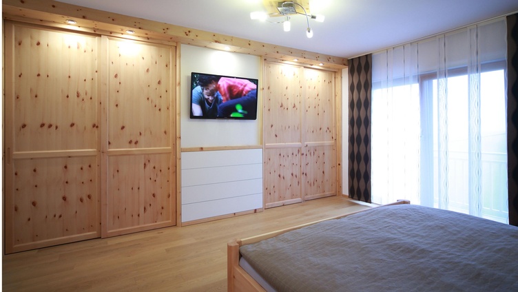 Schlafzimmer in Zirbe geölt, Schleiflack weiß, Boden in Eiche geölt